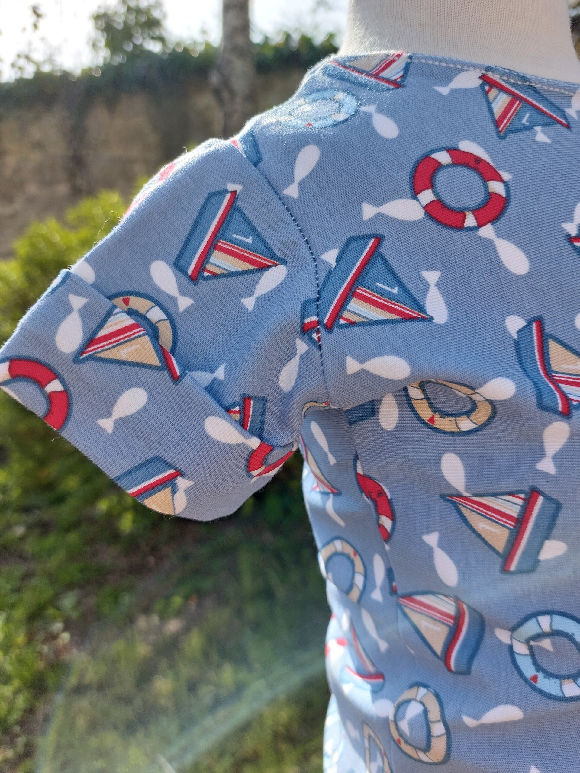 ensemble tee-shirt et short. Tee-shirt à manche courte à revers, 2 boutons pression à l'épaule. Short en double gaze de coton, élastiqué à la taille avec une broderie de bateau.
